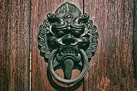 Chinese Stone Lion styled door-handle on a temple door