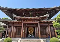 The total layout of the temple includes the Shanmen, the Mahavira Hall, the Hall of the Four Heavenly Kings, the Bell Tower, the Drum Tower, the Buddhist Texts Library, the Hall of the Guanyin, the Hall of Bhaisajyaguru, the Hall of Sangharama Palace, the Dharma Hall, and other structures.[5]