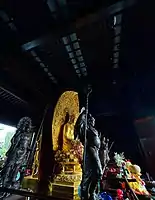 The Mahavira Hall, enshrining statues of Sakyamuni Buddha (Chinese: 釋迦牟尼佛; Pinyin: Shìjiāmóunífó), Manjushri (Chinese: 文殊菩薩; Pinyin: Wénshū Púsà) and Samantabhadra (Chinese: 普賢菩薩; Pinyin: Pǔxián Púsà) sitting down, with statues of Ananda (Chinese: 阿难; Pinyin: Ānán) and Mahakasyapa (Chinese: 摩訶迦葉; Pinyin: Móhējiāyè) standing between them