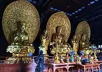 The Hall of Bhaisajyaguru, enshrining a statue of Bhaisajyaguru (Chinese: 藥師佛; Pinyin: Yàoshīfó), flanked by two statues of Sūryaprabha (Chinese: 日光菩薩; pinyin: Rìguāng Púsà) and Candraprabha (Chinese: 月光菩薩; pinyin: Yuèguāng Púsà)