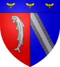 Blazon: Parti per pale, at 1 Gules, a barbel Argent; at 2 Azure, a bend argent potent counter potent Or; in chief Azure chrged with 3 bees flying of Or.