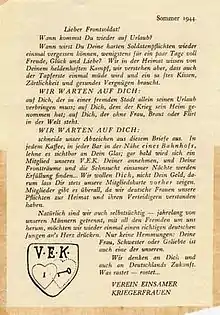 Cut our symbol from this letter. In every coffee shop, in every bar near a railway station, place it to your glass so that it can be clearly seen. A member of our VEK will soon contact you. The dreams you had at the front, and the longings of your lonely nights, will be fulfilled... We want you, not your money. Therefore, you should always let us show you our membership card in advance. There are members everywhere, because we women understand our duties to the homeland and to its defenders.