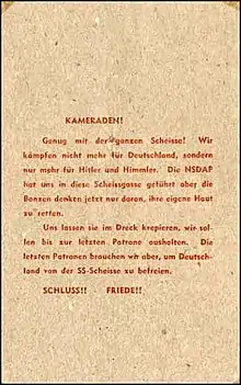 Corporal Lauwers also created the "League of Lonely War Women" or VEK in German. This mythical organization was to demoralize German troops[5] by making them believe that the females in their lives back home were having casual relations with other soldiers.[3] Eight faked field post letters in the German language were produced by the OSS in Italy with the total number of forged field post letters that were printed in Rome being indicated in an OSS production report. 287,000 copies were produced in the period between 15 July 1944 and the end of the war. The operation was so successful that The Washington Post was fooled and ran a story on 10 October 1944 entitled, “German soldiers on leave from the Italian front have only to pin an entwined heart on their lapel during furloughs home to find a girlfriend.” The newspaper got the story from a circular which had been captured on the Eighth Army front and was actually written by Lauwers and carried behind German lines by the Sauerkraut agents.[6]