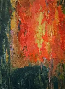 Smith uses a single material: an industrial grade polyester non woven fabric, Lutradur.[16] She uses it as a canvas for acrylics and silk-paint pigments chosen for light fastness. She creates a painting on the tough fabric, then bonds several layers together to form a base on which she collages small pieces of the painted material, heat setting them in place.