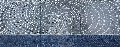 In the 1990s, Takenaga turned to enormous (often twenty-foot-long) acrylic paintings constructed from hollow wooden doors, which used enigmatic abstract shapes and symbols drawn from science, logic and classical Eastern art.[44][20][23] The Long Resonance (1991) is a representative work; it features a cloud-like expanse breaking into a dark, rectangular ground decorated with icons, silhouettes (animals or Japanese figures) and garlands of red, dotted lines that presage her future paintings.[23][44] In subsequent work, she dramatically reduced her scale to intimate (12" x 9") abstractions eliminating signage and recognizable elements.[23] Nevus (1997) and Tortuca (1998) employ whimsical, intricate spirals overlaid on modulated grounds of beige and brown.[45][14] Inspired by an offhand observation of spiraling tufts of hair on her dog, these forms evolved into Takenaga's mature work when she began painting variations on darkened backgrounds, evoking celestial phenomena.[46][24]
