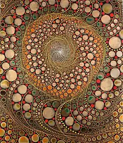 Critics such as Art in America 's Robert Kushner identified an expansion of Takenaga's vocabulary in shows at McKenzie Fine Art (2003, 2005), which yielded surprising, more dynamic arrangements within her tight self-imposed parameters.[31][3][4] Feathery swirls in Wave (2002) suggest studies of ornate, autonomous systems evoking both decorative cross-cultural and scientific imagery; later works resemble vibrant cellular or bubble forms (Rubazu), bulbous spiraled microorganisms (Tarazed #1), and jeweled mandala or Paisley patterns (Gold + Red).[3][4][23] In subsequent work, she explored subdued palettes evoking loss—grays, white, black, pale greens and turquoises, and metallic golds and silvers—and forms suggesting ambiguous, otherworldly environs (Ghost Triptych 2007–8), molecular frameworks or the suction-cup undersides of sea stars and octopi (Ozma, 2009), and bent, skewed grids and lattices like three-dimensional, topographic maps of black holes that approach Op art, such as Angel (pink) (2008) and Zardo (2009).[32][6][23]
