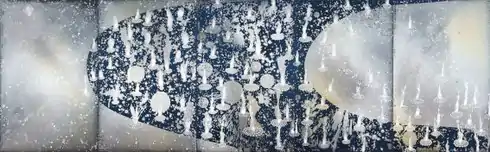 In her later work, Takenaga has admitted more open space and exposed the drips, puddles, and spatters of her modulated underpaintings as a compositional element (e.g., the lantern-like Green Light, 2013).[23][14] She has also continued to expand her associative range to include northern lights, meteor showers (Night Painting (JFM), 2016), geodes and fractals, in work that Ken Johnson describes as viewed more "through the ecstatic, possibly pharmaceutically aided perceptions of a hippie dreamer" than "the technologically assisted eyes of a scientist."[35][36][37]