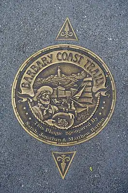 The Barbary Coast Trail is a marked trail that connects a series of historic sites and several local history museums in San Francisco, California. Approximately 180 bronze medallions and arrows embedded in the sidewalk mark the 3.8-mile (6.1 km) trail.