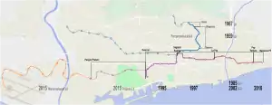 Plans for L2 to reach Montjuïc and Zona Franca in the southwest of Barcelona were first discussed as early as 1971, and another proposal for L2 to terminate near the Estadi Olímpic Lluís Companys was made in 1987. In May 1999, a new master plan was adopted which raised the possibility of L2 potentially being extended to El Prat Airport,[1] and in 2006 the plan was later modified for L2 to share L9 Sud's tracks after Parc Logístic station. L9 Sud is El Prat's first connection to the Metro system, supplementing its current connection to the Rodalies commuter rail system. Under the 2006 plan, L2 and L9 will share the same route from Terminal entre pistes (Aeroport T1) to Parc Logístic, at which point they will diverge. L9 will then continue to the north toward Zona Universitària station, and L2 will travel to the east, entering the city centre. However, the construction of the western extension of L2 has still yet to take place as of 2019.