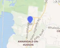 Route 9G, a New York State highway, provides access to the Bard campus at Annandale Road, Campus Road, and River Road. The geographic organization of the campus is centered around Annandale Road, which serves as the de facto campus thoroughfare. The campus comprises three distinct, but unified, regions due to its size and historical development: Central, North, and South Campus.[5] Each historically-rich region is host to both historic and contemporary architecture. Additionally, the campus includes the undeveloped woodlands as far west as the Tivoli Bays Wildlife Management Area, which consists of the North Tivoli Bay, South Tivoli Bay, Cruger Island, Magdalen Island, and many acres of upland forest.