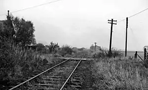The single platform and station building with its ticket office, waiting room, canopy, etc. stood on the northern side of this single track line with sidings and cross over sidings on the northern side serving the waste disposal areas on either side of Station Road, etc. A weighing machine house and a stationmaster's house were present. A signal box is shown at the eastern end of the station.[7][8] The main station building stood at the eastern end of the platform. The 1957 OS map shows a passing loop just to the east of the old station on the single track line with all the trackwork otherwise lifted from the spoil bings, etc.[9]