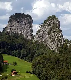 The Barmsteine are two rock towers, 841 and 851 metres above sea level, in the northernmost part of the Hasel Mountains in the Bavarian Alps. They rise above the Austrian town of Hallein, and lie on the border between Salzburger Land in Austria and Berchtesgadener Land in Germany.