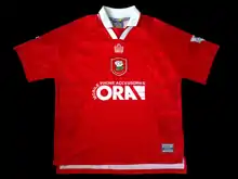 Barnsley have played their home games in red shirts for most of their history. The only exception to this is the period 1887–1901, where it is speculated that the team first wore blue shirts with claret arms, then circa 1890 the team wore chocolate and white stripes, before moving on to blue and white stripes around 1898. The team first wore red shirts in 1901.[21] Since this time, the team have worn red shirts often with a white trim, although in more recent times a black trim has sometimes been used. As with most football clubs the shirt design varies from season to season. One particular design that stands out is the 1989–90 season shirt which featured white stars on a red background and has been named as one of the worst shirts ever.[22] Manufacturers logos were added to the shirt in 1976–77, while sponsors were first added in the 1980–81 season.