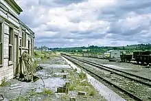 Victoria Road had a very long single platform which was used for the arrivals, plus a bay at the eastern end that was used for departures. The single-storey building was wooden and was provided with a large canopy that extended to the platform edge. From the west end it contained a parcels office, refreshment room (later used as a store and cycle room), booking office, waiting room and ladies' toilet, gentlemen's toilet, station master's office and porter's room.[3] There was a signal box at the eastern end of the platform and a small engine shed and turntable on the south side of the line between the station and the line to Barnstaple Junction.[4][5]