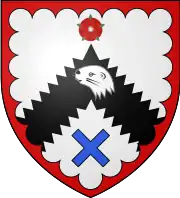 ![]() ![]() Argent, on a chevron indented sable between in chief a rose gules and in base a saltire couped azure, an otter's head erased of the first, a bordure engrailed of the third | |