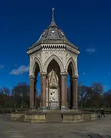 The fountain was designed in 1862 by Henry Astley Darbsihire and erected by Baroness Burdett Coutts at a cost of £5,000.[1] The fountain is made out of granite, and is a 28 feet (8.5 m) diameter octagon with 60 feet (18 m) red granite columns, in the Gothic style, and is situated near to the Hackney gate of the park.[2][3] The opening of the fountain in 1862 was attended by 10,000 spectators.[4][5] The year after the fountain was installed, The Illustrated London News called Victoria Park the best people's park in London, due to its facilities such as the fountain.[6] In his Dictionary of London, Charles Dickens, Jr. described the fountain as "beautiful".[7]