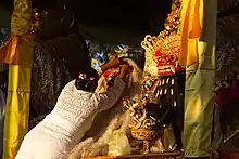 Barong is a panther-like creature and character in the Balinese mythology of Bali, Indonesia. He is the king of the spirits, leader of the hosts of good, and enemy of Rangda, the demon queen and mother of all spirit guarders in the mythological traditions of Bali. The battle between Barong and Rangda is featured in the Barong dance to represent the eternal battle between good and evil.[1]