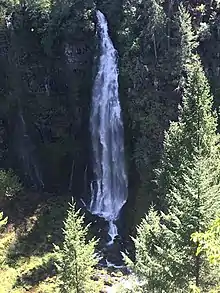 Barr Creek Falls, is a waterfall located in the Rogue River Canyon within the Prospect State Scenic Viewpoint in Jackson County, in the U.S. state of Oregon. The waterfall is located at the south end of Barr Creek as it plunges into the Rogue River over a carved cliff surrounded by walls of petrified volcanic ash as a consequence of the Mount Mazama eruption. The waterfall has also been called Bear Creek Falls.[1] The waterfall gets its name from the creek which was called "Barr" for the presence of a fence that prevented cattle from straying out of the local Red Blanket Ranch and that ran adjacent to the creek.[2]