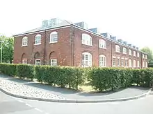 A review conducted following the demise of the Board of Ordnance in 1855 noted that only seven barracks outside London had accommodation for more than 1,000.[8] This changed with the establishment of large-scale Army Camps such as Aldershot (1854), and the expansion of Garrison towns such as Colchester; over time in these locations temporary huts were replaced with more permanent barracks buildings. Large-scale camps were not the only way forward, however; from the 1870s, the localisation agenda of the Cardwell Reforms saw new and old barracks established as depots for regional or County brigades and regiments. The latter part of the 19th century also saw the establishment of a number of Naval barracks (an innovation long resisted by the Royal Navy, which had tended to accommodate its sailors afloat either on their ships or else in hulks moored in its harbours). The first of these, Keyham Barracks in Devonport (later HMS Drake), was begun in 1879, and only completed in 1907.