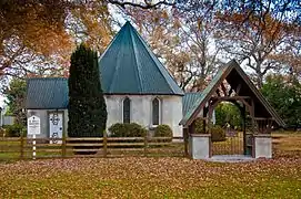 St John's Church was mostly paid for by Wason,[22] and construction started in 1876, with the first service held on 8 July 1877 by the vicar of Ashburton, W. E. Paige.[11] A vicarage was also envisaged, but it was never built. A lych gate was added as a centennial project.[3] St John's belongs to the Rakaia parish of Te Pīhopatanga o Te Waipounamu (the south island Māori bishopric) of the Anglican Church in Aotearoa, New Zealand and Polynesia, with services each second Sunday of the month.[23] The church was registered as a heritage building by the New Zealand Historic Places Trust (since renamed to Heritage New Zealand) on 23 June 1983 with registration number 1765 classified as C.[24] With the change of the classification system, the building later became a Category II listing.[25] The church is owned by Church Property Trustees (i.e. the Anglican Church).[26]