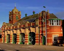 The Central Fire Station on Abbey Road in Barrow-in-Furness, Cumbria, England is a Grade II listed former fire station that has been described by Historic England as a "well-preserved example of the first generation of fire station built specifically for motorised appliances".[1] Constructed in 1911 and opening a year later, the building served as the town's only station until Cumbria Fire and Rescue Service completed their first new-build station on Phoenix Road in 1996.[2] The building is noted for its striking red brick facades and buff terracotta dressings, it bears a strong resemblance to the Technical School built less than 10 years prior nearby on the opposite side of Abbey Road. The building has since been converted into a 'Bed Brigade' store.