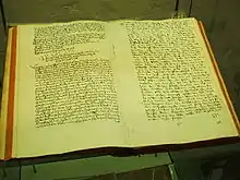 In 1595, at the age of 75, Sastrow wrote an autobiography.[6] He made use of a variety of source materials: in addition to his own journaling and letters, official documents to which he had access as a notary and chronicles such as Johann Berckmann's Stralsund Chronicle and the biography of his predecessor as mayor, Franz Wessel. He modelled his use of these sources on Johannes Sleidanus' history, published in 1545–56.[7] He may also have incorporated sections which he had composed earlier. He had the text written by a scribe; as a result, even the primary manuscript is not by his own hand, although handwriting evidence indicates that he added notes and corrections to the completed text.[8]