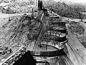 In response to the Great Depression and subsequent drops in crop prices, farmers struggled harder to have a dam constructed on the Verde River.[1] Finally, in 1935, the Salt River Project received approval to build the Bartlett Dam. The U.S. Bureau of Reclamation constructed the dam between 1936 and 1939, in a total of 1,000 days.[2] Upon completion, the dam was the tallest multiple arch buttress type in the world at the time.[3] 80% of the funding for the dam was provided by the Salt River Project (SRP) and 20% by the Bureau of Indian Affairs.[4] Construction on the dam provided needed jobs and flood control on the river. Although flood waters temporarily halted construction in February, 1937, flooding was finally minimized with the construction of the dam. The next large flood in the area would not come until the winter of 1965-66.[5]