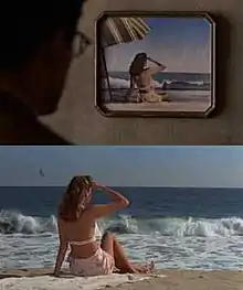 The picture in Barton's room of a woman at the beach is a central focus for both the character and camera. He examines it frequently while at his desk, and after finding Audrey's corpse in his bed he goes to stand near it. The image is repeated at the end of the film, when he meets an identical-looking woman at an identical-looking beach, who strikes an identical pose. After complimenting her beauty, he asks her: "Are you in pictures?" She blushes and replies: "Don't be silly."[31]