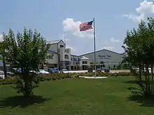 The land for Bartram Trail High School was purchased in January 1999.[64] The school was constructed by Arcadis.[6] The Bartram Trail High School campus takes up one hundred and twenty acres of land and the school building takes up 190,000 square feet (18,000 m2).[6] The school building is a two-story octagon with an open-air courtyard in the center. The cafeteria and media center are located within the main building, while the gymnasium and auditorium with a stage are attached on the south and north sides, respectively.[64] The campus has walkways, student, faculty and visitor parking, a parent drop-off section, a bus loop, a football and track stadium, a baseball and softball field, tennis courts, general-use play fields, a stormwater treatment facility, water and sewer utilities and a wetland mitigation area.[6]