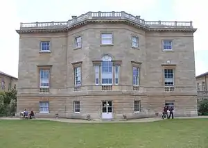 Basildon Park was begun in 1772; the architect, John Carr of York, was one of the leading architects in northern England. His work was initially influenced by the Palladian architects, the Earl of Burlington and William Kent and later by the neoclassicism of Robert Adam.[26] At Basildon, Carr's most southerly commission,[27] both these architectural influences can be discerned. It has been speculated that the principal facade, the West Front, was inspired by Palladio's Villa Emo.[28] Whatever the inspiration, it was one Carr relied on heavily in his work, and it can be seen again most evidently in his designs for Newark Town Hall.