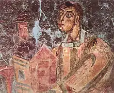 The church is known for the frescoes which cover the nave's walls and the apse. The latter are likely earlier than the former, as testified by the different style.[2] The apse frescoes show two bands of pictures with animals and vegetable motifs. They are surmounted by a praying Jesus within an almond frame. Jesus is wearing sandals, an uncommon feature of such depictions. He is flanked by two old men, the prophets Jeremiah and Ezekiel, behind whom are the two archangels Michael and Gabriel and two crowds. The lower walls of the apse show a short cycle of stories of St Vincent of Saragossa. The fourth panel features St Aribert offering a model of the church to God: the upper part of this scene is now at the Pinacoteca Ambrosiana of Milan.