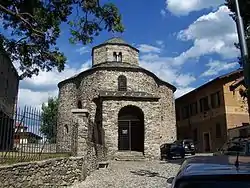 Next to the church is the contemporary Baptistry of St John, which was built at the same time. Its plan is inspired by that of the 9th century Santa Maria presso San Satiro in Milan, although in a simplified form: a cruciform shape with a square hall limited by four isolated columns and four perpendicular arches, and four semicircular niches. The western niche opens to the interior, from which stairs lead to the matronei (tribunes in the upper floor), which are not present in San Satiro. The interior ends with a dome, externally covered by an octagonal drum with four windows and small arches.