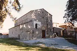 The church has a simple and undecorated façade, in rough cobblestones. In the center is a portal with an architrave and an ogival lunette. The apse protrudes substantially from the main body. It features an archaic type of Lombard bands, with isolated arches characterized by pilasters that connect them to the ground. There are three windows which give light to the crypt: these are slightly different from those of the nave, due to the presence of a slight internal slope. The only remaining side apse is partly visible at the right.