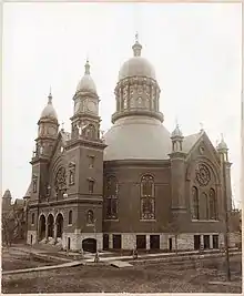 Winona grew rapidly during the 1880s and 1890s, and the continuation of the Kashubian diaspora played a major part of this population boom. By 1893, Saint Stanislaus Kostka Parish had completely outgrown its old sanctuary. Creation of a satellite Polish parish on Winona's West End was considered; indeed, such a parish, Saint Casimir, would be established in 1906. The congregation was bitterly divided on the question of whether to build a new church or expand the old.[2] But as a matter of religious and civic pride, the parishioners of Saint Stanislaus Kostka decided to build a larger, grander 1800-seat structure on the site of their present church.