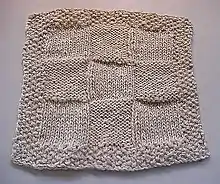 In its simplest form, basketweave is composed of a checkerboard pattern of identical rectangles that alternate between stockinette stitch and reverse stockinette stitch.[1] In this form of basketweave, the only variables are the dimensions of the rectangles, i.e., the number of stitches across and number of rows long. If the rectangles are much longer vertically than horizontally, a basketweave may also be called a broken rib pattern. Similarly, if the rectangles are much longer horizontally than vertically, a basketweave may also be called a broken welt pattern. More complicated types of basketweave can be made with allowing the rib and welt widths to vary (i.e., by using rectangles of different sizes), and by allowing some rows or welts to continue uninterrupted.