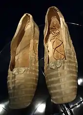 The museum's oldest piece of footwear from Europe are a pair of sandals, worn by a shepherd from the Tyrolian Alps around 5200 BP.[19] The museum's oldest pair of shoes from the Americas is believed to be an Anasazi made from yucca fibres.[35] The museum also holds a collection of shoes worn by notable individuals, including Pierce Brosnan, Roger Federer, Terry Fox, Elton John, Karen Kain, John Lennon, Madonna, Marilyn Monroe, Napoleon, Elvis Presley, Robert Redford, Elizabeth Taylor, Pierre Trudeau, and Queen Victoria.[31][36]
