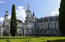 The Monastery of Batalha (Portuguese: Mosteiro da Batalha) is a Dominican convent in the municipality of Batalha, in the district of Leiria, in the Centro Region of Portugal. Originally, and officially, known as the Monastery of Saint Mary of the Victory (Portuguese: Mosteiro de Santa Maria da Vitória), it was erected in commemoration of the 1385 Battle of Aljubarrota and would serve as the burial church of the 15th-century Aviz dynasty of Portuguese royalty. It is one of the best and original examples of Late Flamboyant Gothic architecture in Portugal, intermingled with the Manueline style.