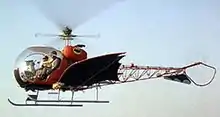 The Batcopter was a functional helicopter provided by National Helicopter Service.[5] It was based on the Bell 47, which was designed by Bell Helicopter Textron in 1941. The Batcopter was a G3B-1 model with FAA registration N3079G,[6] which had previously been used in the TV-series Lassie[7] and ABC News. To make the model look more like a superhero vehicle, it was fitted with canvas-covered tubular frames and was painted red. The head of a bat was painted in the front while the Batman symbol was painted on the side. The most dangerous design change was the wings, which reduced power by nearly fifty percent.