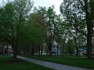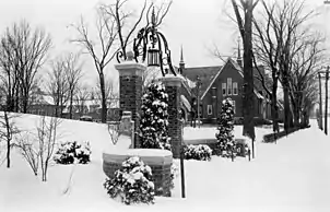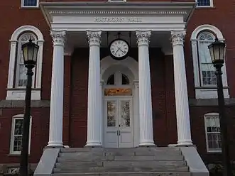 Bates is in a former mill town, Lewiston, which has a large French Canadian ethnic presence due to migration from Quebec in the 19th century. The college is known for cultural strains with the town, townspeople describing Bates as a "leafy oasis of privilege."[142] The overall architectural design of the college can be traced through the Colonial Revival architecture movement, and has distinctive Neoclassical, Georgian, Colonial, and Gothic features. The earliest buildings of the college were directly designed by Boston architect Gridley J.F. Bryant, and subsequent buildings follow his overall architectural template.[92] Colonial restoration influence can be seen in the architecture of certain buildings, however many of the off campus houses' architecture was heavily influenced by the Victorian era.[92] Many buildings on campus share design parallels with Dartmouth College, University of Cambridge, Yale University, and Harvard University.[143][144]