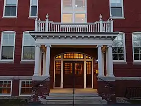 While attending (and later leading) the Freewill Baptist Parsonsfield Seminary, Bates founder, Oren Burbank Cheney worked for racial and gender equality, religious freedom, and temperance.[13] In 1836, Cheney enrolled in Dartmouth College (after briefly attending Brown), due to Dartmouth's significant support of the abolitionist cause against slavery.[13] After graduating, Cheney was ordained a Baptist minister and began to establish himself as an educational and religious scholar.[13] Parsonsfield mysteriously burned down in 1854, allegedly due to arson by opponents of abolition.[14][13] The event caused Cheney to advocate for the building of a new seminary in a more central part of Maine.[13] With Cheney's influence in the state legislature, the Maine State Seminary was chartered in 1855 and implemented a liberal arts and theological curriculum, making the first coeducational college in New England.[15][16] Soon after establishment several donors stepped forward to finance portions of the school, such as Seth Hathorn, who donated the first library and academic building, which was renamed Hathorn Hall.[13] The Cobb Divinity School became affiliated with the college in 1866. Four years later in 1870, Bates sponsored a college preparatory school, called the Nichols Latin School.[13] The college was affected by the financial panic of the later 1850s and required additional funding to remain operational.[13] Cheney's impact in Maine was noted by Boston business magnate Benjamin Bates who developed an interest in the college. Bates gave $100,000 in personal donations and overall contributions valued at $250,000 to the college.[17] The school was renamed Bates College in his honor in 1863 and was chartered to offer a liberal arts curriculum beyond its original theological focus.[18] Two years later the college would graduate the first woman to receive a college degree in New England, Mary Mitchel.[19] The college began instruction with a six-person faculty tasked with the teaching of moral philosophy and the classics. From its inception, Bates College served as an alternative to a more traditional and historically conservative Bowdoin College.[20][21] There is a complex relationship between the two colleges, revolving around socioeconomic class, academic quality, and collegiate athletics.[22][23]