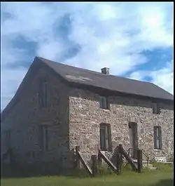 The barn is also 1-1/2 stories, with a gambrel roof. The stone walls only extend to the floor of the loft, with frame construction above.