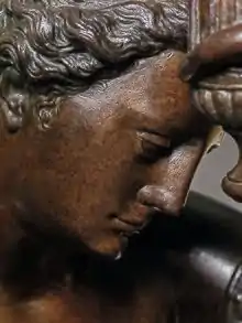 is the partial use of ‘unfinished’ (non-finito) areas. It is a stylistic device that Giambologna adopted from Donatello and which he used for his bronze sculptures throughout his career. Its crucial importance for the understanding of Giambologna's style has been analysed by recent scientific research. Typically, the garment of the bronze Bathing Venus was deliberately left unfinished in parts, creating liveliness by contrasts of texture.[10]