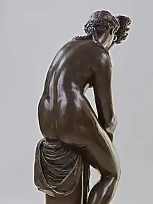 The bronze Bathing Venus holds her raised hand with a beaker in front of her face, blocking her sightline. The viewer can therefore approach the goddess without being noticed by Venus. Only when right in front of her can one see all her feminine attributes and a mutual discovery can take place. The motif of the raised left leg is an allusion to the typology of the ancient Venus removing her sandals. Not only does Giambologna borrow from ancient Venuses the game of simultaneously hiding and revealing, he now manifests a particular delight in the indiscreet observation of the female nude matching the courtly taste of the late Renaissance.[9]
