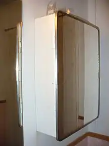 A bathroom cabinet is a cabinet in a bathroom, most often used to store hygiene products, toiletries, and sometimes also medications such that it works as an improvised medicine cabinet. Bathroom cabinets are usually placed under sinks, over sinks, or above toilets. Many mirror cabinets are combined with a lamp that illuminates the mirror and thereby (especially in small bathrooms) also the room. Bathroom cabinets often either have an integrated electrical socket or are placed close to one so that appliances such as an electric shaver or hairdryer can be used. Bathroom cabinets have become much more technologically advanced with retailers today offering features like Bluetooth audio, mood lighting, and anti-fog technology.