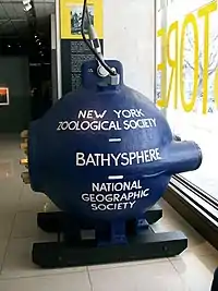 After Beebe stopped using the Bathysphere, it remained the property of the New York Zoological Society. It remained in storage until the 1939 New York World's Fair, where it was the centerpiece of the society's exhibit. During World War II, the sphere was loaned to the United States Navy, which used it to test the effects of underwater explosions. The Bathysphere was next put on display at the New York Aquarium in Coney Island in 1957. In 1994, the Bathysphere was removed from the Aquarium for a renovation, and languished in a storage yard under the Coney Island Cyclone until 2005,[4] when the Zoological Society (now known as the Wildlife Conservation Society) returned it to its display at the aquarium.[8] The Bermuda Aquarium, Museum and Zoo (to which Beebe had given some of Bostlemann's original drawings) has long displayed a copy of the bathysphere, and another reproduction is on display at the National Geographic Museum.[9][10]