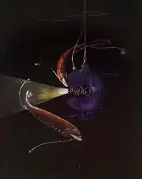 Beebe named several new species of deep-sea animals on the basis of observations he made during his Bathysphere dives, initiating a controversy which has never been completely resolved. The naming of a new species ordinarily requires obtaining and analyzing a type specimen, something which was obviously impossible from inside the Bathysphere.[2] Some of Beebe's critics claimed that these fish were illusions resulting from condensation on the Bathysphere's window, or even that Beebe willfully made them up, although the latter would have been strongly at odds with Beebe's reputation as an honest and rigorous scientist.[8] Barton, who was resentful that newspaper articles about his and Beebe's Bathysphere dives often failed to mention him, added to ichthyologists' skepticism by writing letters to newspapers that contained wildly inaccurate accounts of their observations.[4] While many of Beebe's observations from the Bathysphere have since been confirmed by advances in undersea photography,[3] it is unclear whether others fit the description of any known sea animal.[11] One possibility is that although the animals described by Beebe indeed exist, so much remains to be discovered about life in the deep ocean that these animals have yet to be seen by anyone other than him.[2]