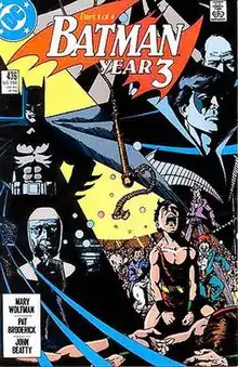 "Year Three" is a comic book storyline published in the United States by DC Comics, which explores Batman's third year as a crimefighter. It was written by Marv Wolfman and pencilled by Pat Broderick and originally appeared in Batman #436–439 (Aug – Sept 1989), which were published semi-monthly and featured covers by George Pérez.