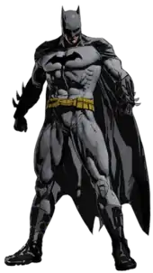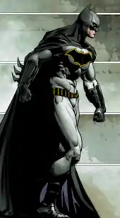 The Batsuit (or Bat-Suit) is the costume of DC Comics’ fictional superhero Batman, who appears in their American comic books. The suit has been depicted in various ways, and the stories themselves have described Batman as modifying the details of his costume from time to time. However, it usually consists of a gray body suit, the chest emblazoned with a stylized black bat either with or without a yellow ellipse around it, and blue-black accessories: a wide scalloped cape, gloves with a series of fin-like projections, black trunks, boots, and a close-fitting cowl (covering the upper half of his face) with ear-like projections to suggest a bat's head; and a yellow or gold utility belt containing a variety of gadgets.
