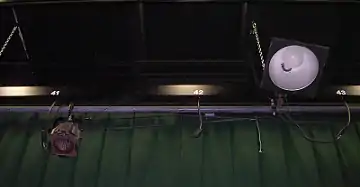 An electric is a batten that incorporates electrical cables above the pipe, often enclosed in a raceway. It typically has power cables for lights and DMX512 data cable for lighting control, and may also have audio cables for microphones. The cables emerge from one end of the batten and continue through a snake to dimmers, control boards, or patchbays. All cable plugs have identifying numbers printed on them so that they can be easily referenced by the lighting control system. Loaded electrics are among the heaviest types of battens, often weighing more than a thousand pounds.