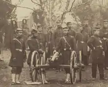 The battery participated in William Sooy Smith's cavalry expedition from Collierville to Okolona and West Point, Mississippi on 11–26 February 1864.[2] At West Point, though confronted by a very inferior force under Nathan Bedford Forrest, W. S. Smith ordered his 7,000 cavalry and 20 guns to begin a retreat on 21 February. In the Battle of Okolona on 22 February, a brigade of Federal cavalry panicked and galloped away, causing five guns to be abandoned.[10] W. S. Smith's report stated that the fleeing cavalry, "drove a battery of little pop-guns off into a ditch, where it was so badly smashed up that we could not get it along". He asserted that the guns were spiked, the ammunition was destroyed, and the horses were saved. W. S. Smith noted that it was Perkins' battery of six M1841 mountain howitzers, and not Battery K.[11] Forrest reported having no more than 2,500 Confederate cavalry. Colonel George E. Waring Jr., who commanded one of the Federal brigades reported that the, "expedition filled every man connected with it with burning shame".[12] Smith reported 388 casualties.[13]